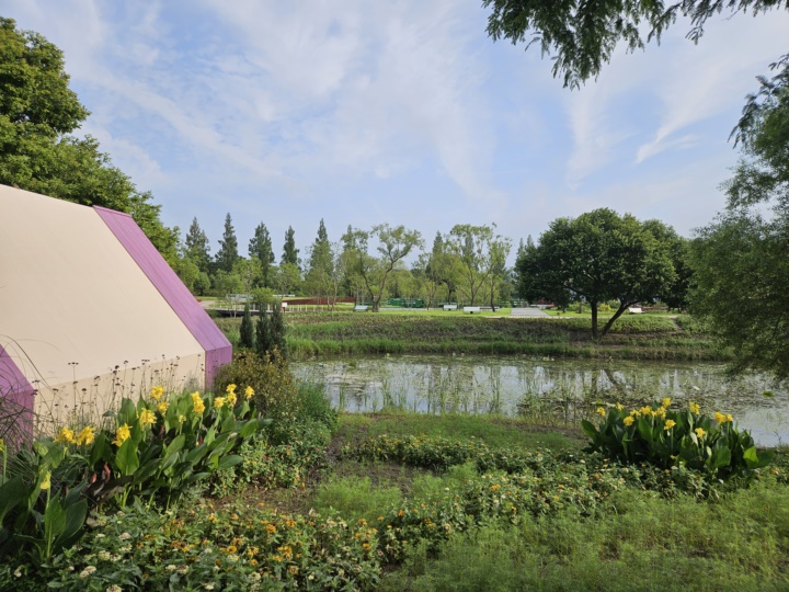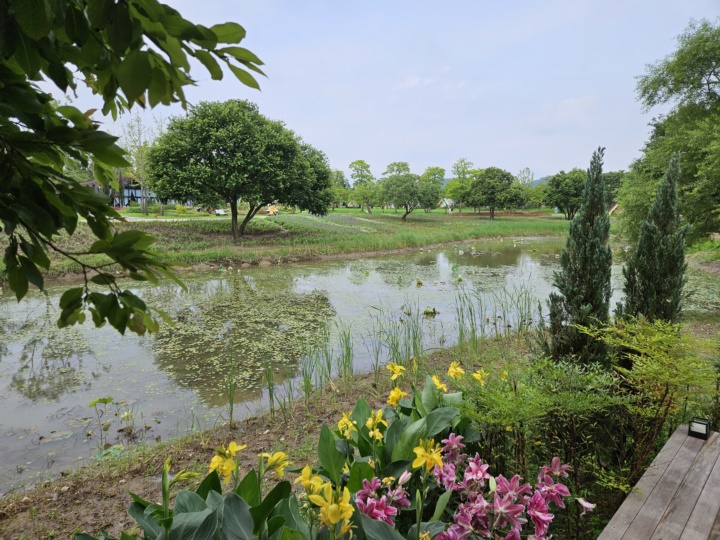 호수 바로 앞이고 사방이 꽃과 나무라