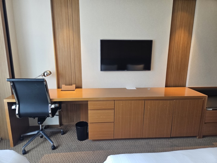 벽면으로는 벽걸이TV랑 긴 데스크가 배치됨
