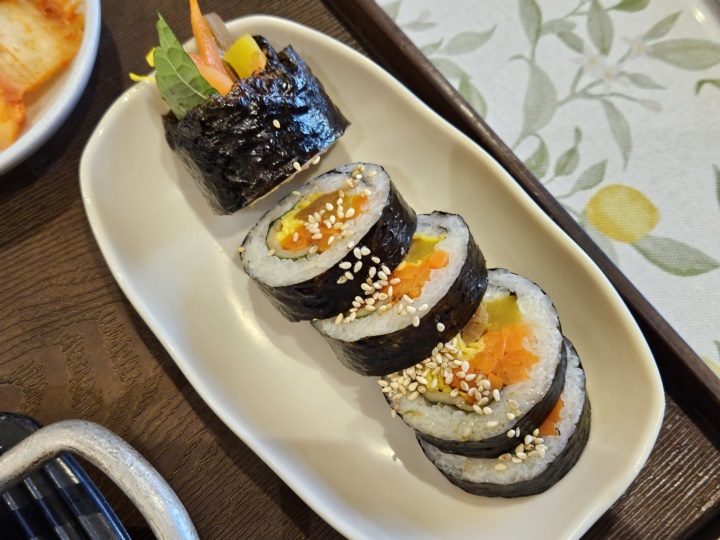 라면김밥세트는 단무지랑 김치가 나온다.