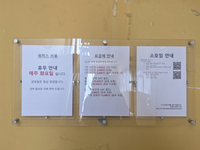 동네에 있는 보드게임 체인점을 모두 다녀보았는데 더 다양한 게임을 플레이해보고 싶어서 게임 보유량이 많다는 인천 계산동의 위치스브루를 찾았다.