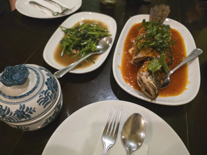 나는 농어요리를 좋아해서 농어튀김(ปลากะพงทอดกรอบราดพริก)과 모닝글로리, 푸팟퐁커리 등을 주문했다.