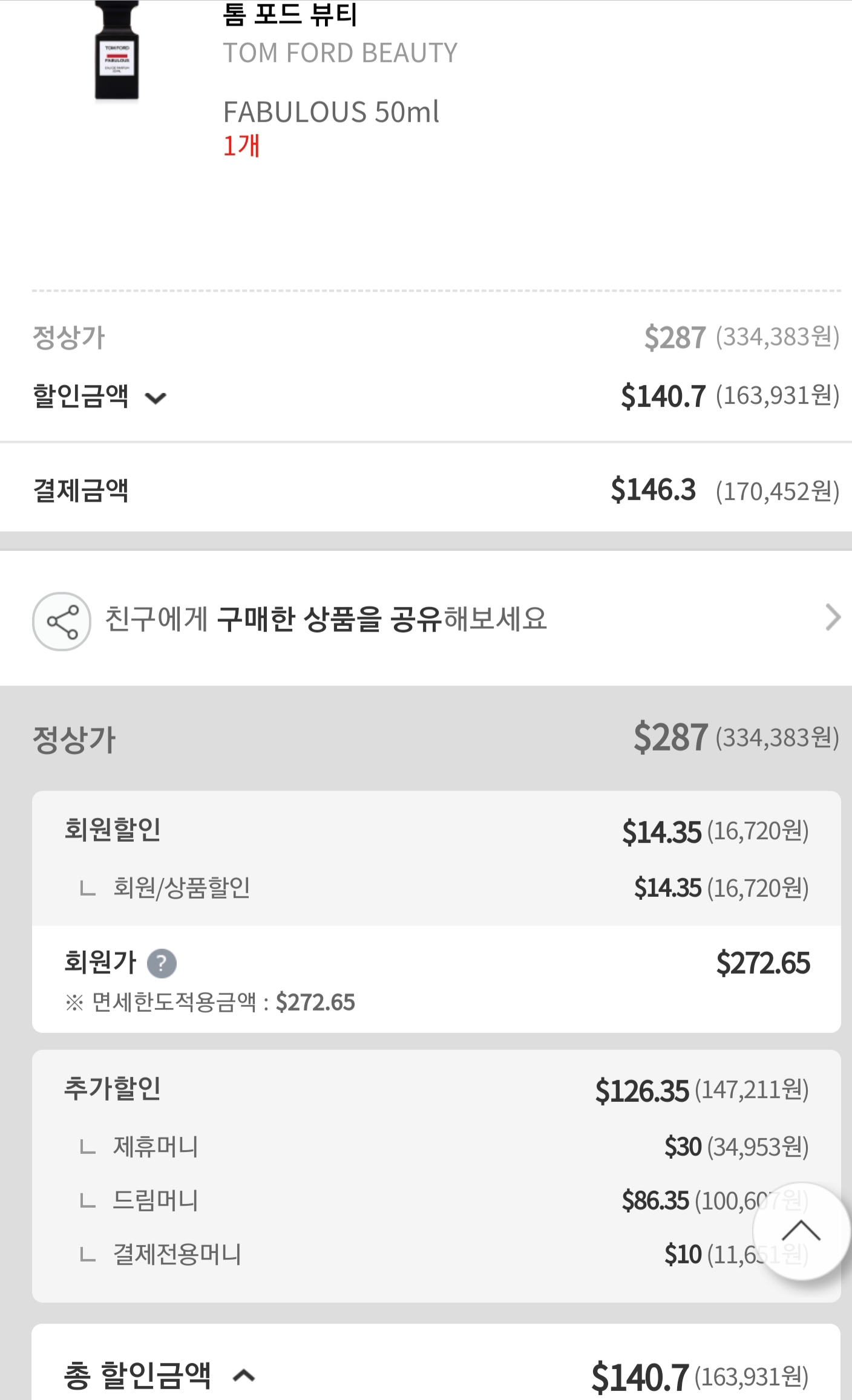 톰포드 뷰티 패뷸러스 50ml은 면세점 정상가 $287이다. 여기에서 회원등급별 할인율, 추가할인(제휴머니, 드림머니, 결제전용머니 등) 적용에 따라 최종 결제 금액이 차이가 난다. 이번에 톰포드 패뷸러스는 17만원 정도에 구입했으니 거의 시중가 절반으로 구입한 셈이다.