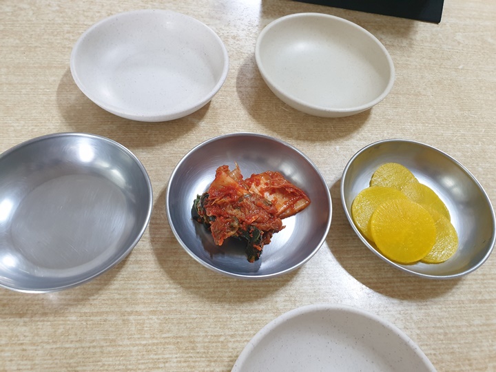 플라스틱 앞접시는 개인 메뉴 덜어먹을 때 사용하고, 스뎅접시는 단무지, 배추김치 그리고 바지락(칼국수에 들어가는 재료) 담는 용도라는 코멘트를 친절히 덧붙이신다.