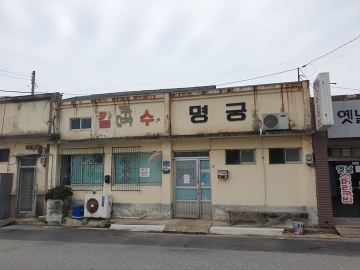 군산에서 가장 오래된 칼국숫집이라는 명궁, 몇 차례 군산 여행은 명궁칼국수에 가고 싶어서였는데 이번에야 드디어 성공했다. 오랜 세월동안 같은 자리에서 장사를 한다는 것은 맛있다는 뜻이기도 하니 당연히 맛있기도 하겠지만, 꼭 가보고 싶었던 이유는 따로 있다. 바로 영화 '군산 거위를 노래하다'를 보고난 후였다. 영화배우 박해일의 찐팬이라 거위는 몇 번이고 반복해서 본 영화이다. 영화에 군산식당 주인역으로 문숙 배우님이 나오는데, 그 군산식당 촬영지가 명궁칼국수이다.