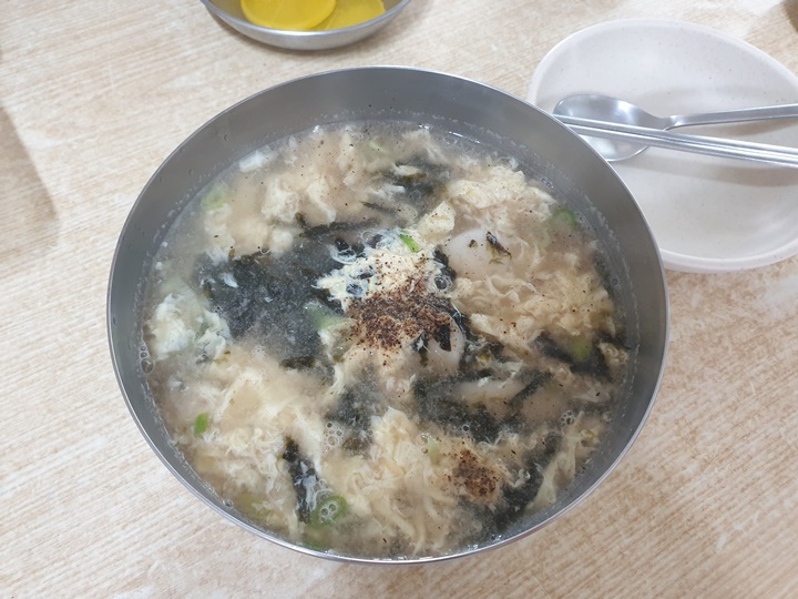 계란을 넉넉히 풀고 김가루 후추 팍팍 뿌린 떡국, 집에서 끓여먹는 바로 그 비주얼과 맛이다. 아이는 계란 많이 풀어진 떡국을 좋아하지 않는데 어쩔 수 없었다 ㅎㅎㅎ 양은 많고 간은 약간 싱거운 편이다.