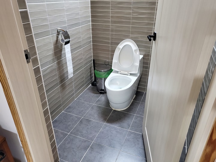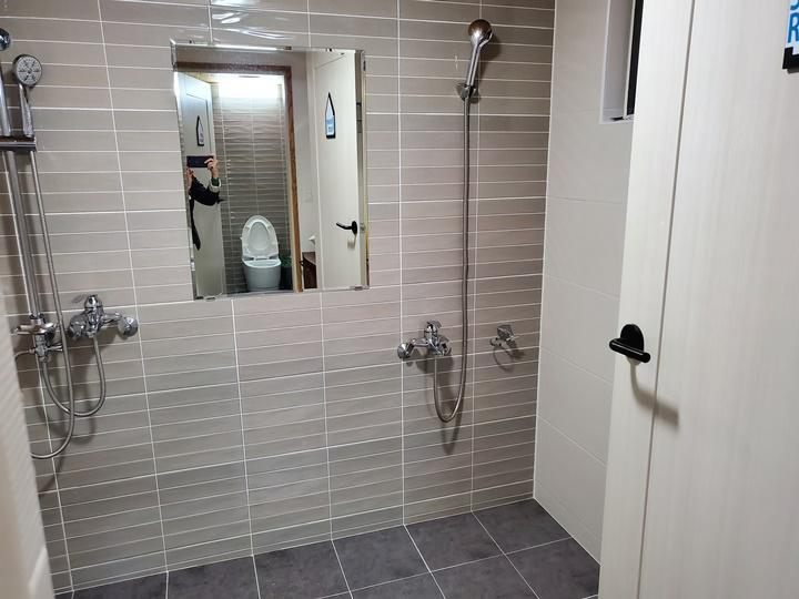 샤워실과 화장실 사이에 세면대가 있고, 샤워칸에는 샤워기가 2대라서 편했다. 비누가 없어서 챙겨간 것을 사용했는데 나중에 본 샤워실 창문틀에 치약과 함께 놓여 있었다. 세면대 근처에 드라이어 콘센트가 있으면 참 좋을 텐데... 거울 없는 콘센트 근처에서 머리카락을 말리고 화장을 하려니 그 점이 다소 애매했다.