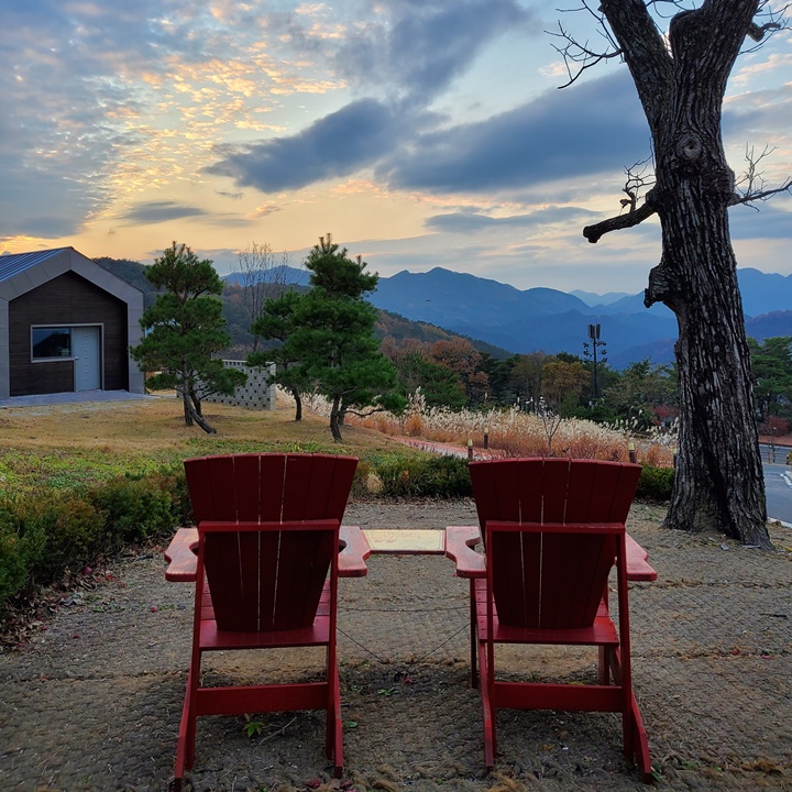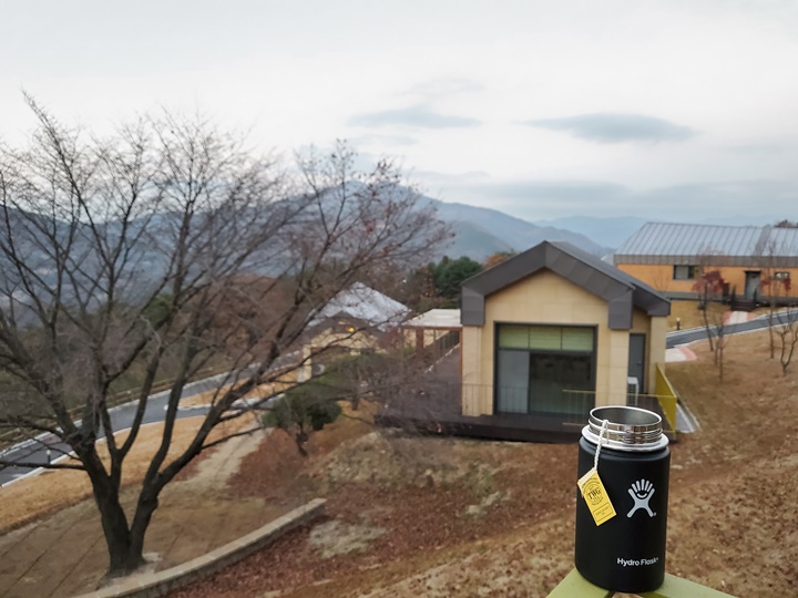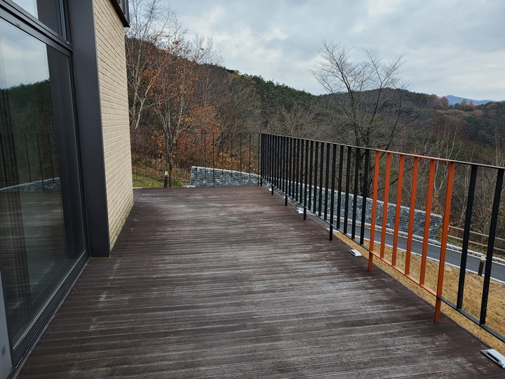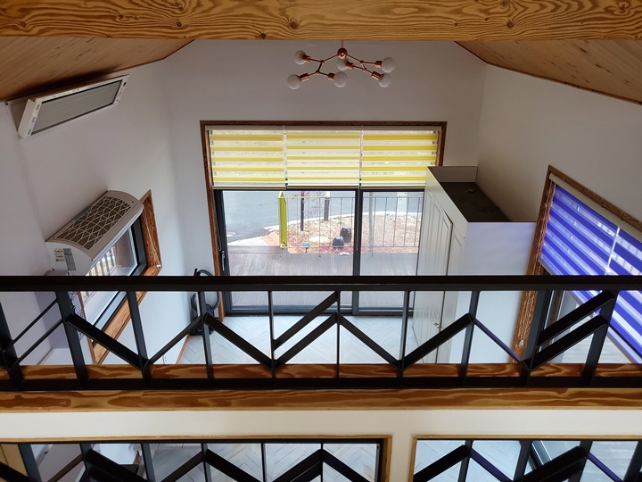 2면은 큰 창으로 되어 있지만, 물고기자리는 제일 끄트머리에 위치하고 있어서 오가는 사람이 거의 없기 때문에 블라인드는 밤에만 내렸다. 나무데크가 꽤 넓어서 의자 두고 차를 마시거나 풍경을 감상하니 절로 마음이 평온해졌다.
