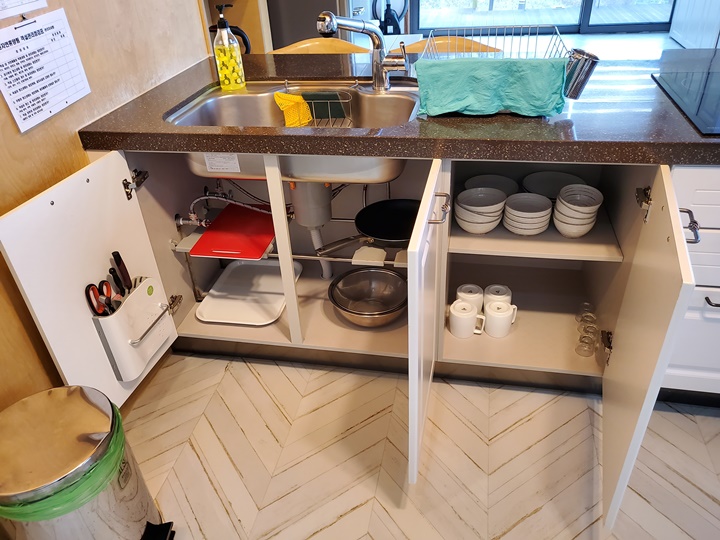 물고기자리는 4인 기준 숙박동이라 모든 것이 4인 기준으로 맞춰져 있다. 밥, 국그릇뿐만 아니라 칼, 도마, 냄비, 컵 등도 있으니 따로 준비해올 것은 딱히 없어 보인다.