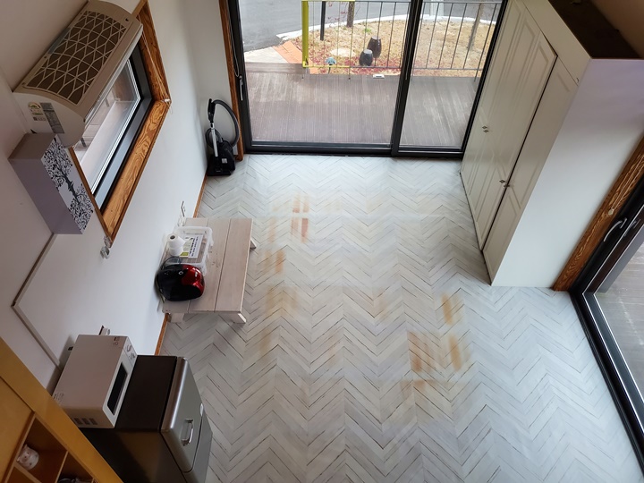 위에서 내려다본 모습, 거실 겸 주방 장판 바닥에 갈색으로 변한 부분에 난방선이 깔린 모양이다. 그 부분이 특히 따숩다 ^^