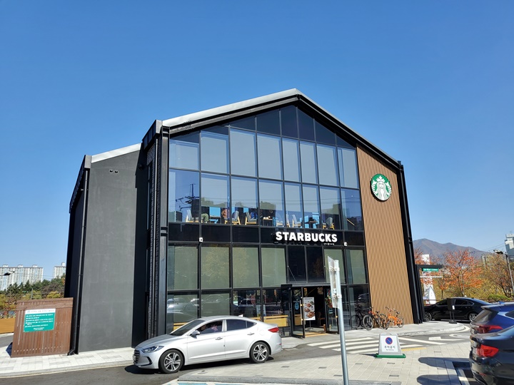 수안보에서 아점을 먹고 집으로 향하는 길, 그냥 가기는 아쉬운 맑은 가을 날씨를 만끽하고자 전망이 멋진 카페를 검색해보았다. 마침 멀지 않은 곳에 스타벅스가 있었고, 유효기간이 며칠 남지 않은 별쿠폰이 몇 장 있어서 사용할 겸 들러보았다. 전망이 좋은 곳에 위치해서 항상 사람이 많다고 하던데, 본격적으로 커피를 즐기기에는 다소 이른(?) 시간이라 그랬는지 한산한 편이었다.