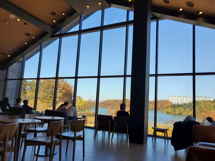 호암지 방향으로 액자처럼 창문이 나 있어서 창가쪽 자리는 인기가 많다. 기다렸다가 창가자리 앞에서 예쁜 사진을 담아가려는 선남선녀도 종종 보였다.