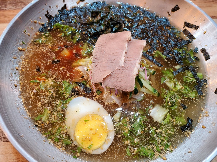 따뜻한면1, 시원한면1, 육회1을 주문했는데 따뜻한면은 주문하고 5분 정도 지났을까? 여튼 가장 빨리 나왔고 시원한 면류는 그 후로 10분쯤 뒤에 나왔다.