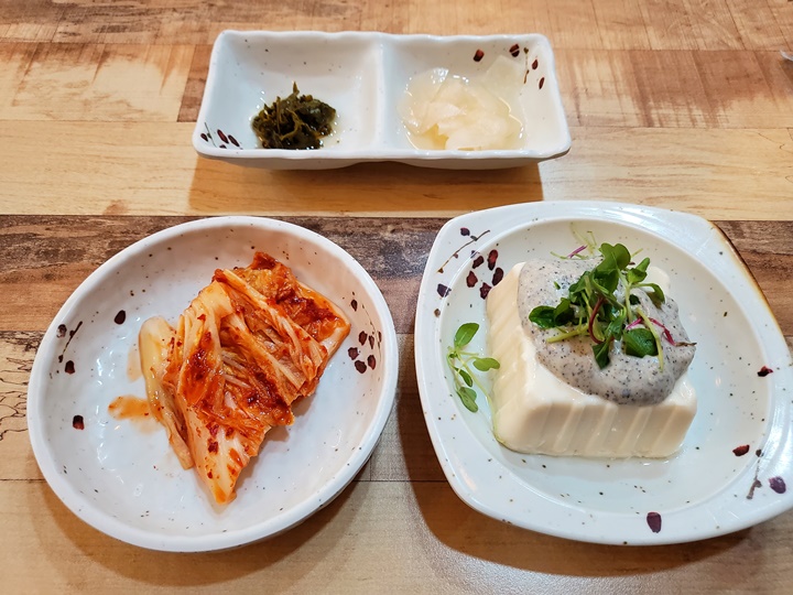 주문을 하니 반찬이 먼저 나온다. 가게 이름과 면에면 특이점이 있는 게 아니라 반찬에도 특이점이 있다. 국수집인데 보통 김치와 단무지 반찬이 나오는 것과는 다르게 배추김치와 흑임자 드레싱 연두부가 나온다. 초피(제피) 장아찌와 무절임도 같이 나오는데 연두부와 초피 장아찌가 특히 맛있었다.