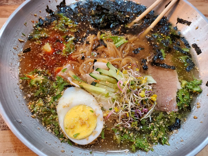 다르다면 메뉴에는 초피가 들어간다. 처음에는 치커리인가 했는데 아니었다. 그 외에도 김가루, 삶은 계란 1/2개, 채 썬 채소, 마늘 편도 넉넉히 올려졌다. 단양 여행하면서 마늘 섭취량 up, up! 시원한 면과 거의 비슷하고 육회 토핑이 얹어진 메뉴로 한층 더 든든하게 먹을 수 있는 메뉴이다.