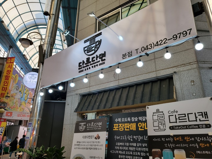 돌아다니며 먹거리 구경하고 하나 둘 구입하는 재미가 쏠쏠했던 단양 구경시장. 흑마늘닭강정 주문 후 1시간 정도 기다려야 했기 때문에 구경하다 지친 다리와 허기를 채울 겸 다르다면&다르다캔에 들어갔다. 국숫집 이름이 '다르다면'이다 :D