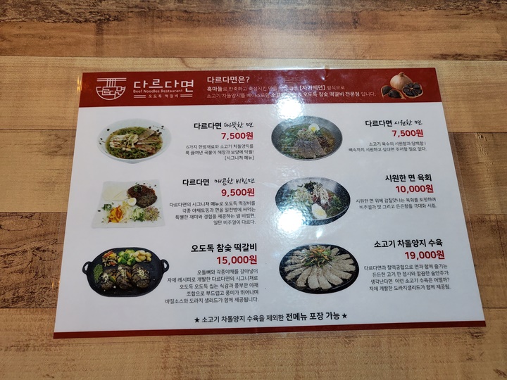 소고기 차돌양지 수육을 제외한 전메뉴 포장이 가능하며 음료 종류는 페트캔에 담아 판매한다. 그래서 가게 이름이 다르다면&다르다캔 이다.