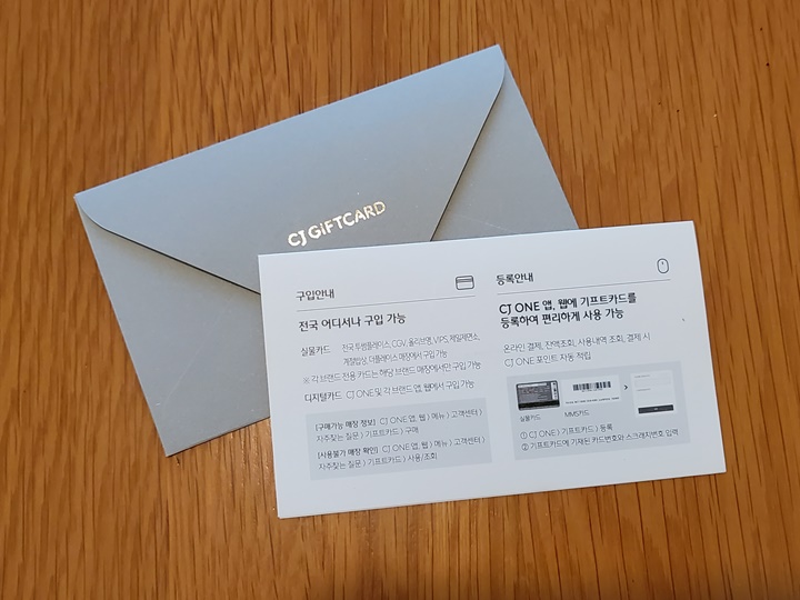 CJONE 어플-나의ONE-나의기프트카드에서 기프트카드 등록을 하면 된다. 카드번호 16자리와 스크래치/인증번호 6자리를 입력하면 등록 끝! 기프트카드는 최대 15개까지 등록가능하며 등록된 기프트카드는 CJ ONE 멤버십 적립카드로도 사용이 가능하다. 기프트카드 유효기간은 5년이며 소멸 전 총 3회 이메일로 소멸 안내를 한다.
