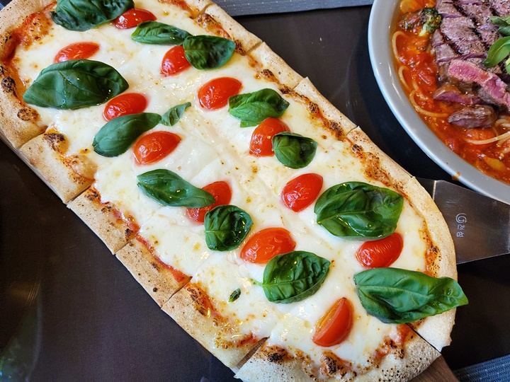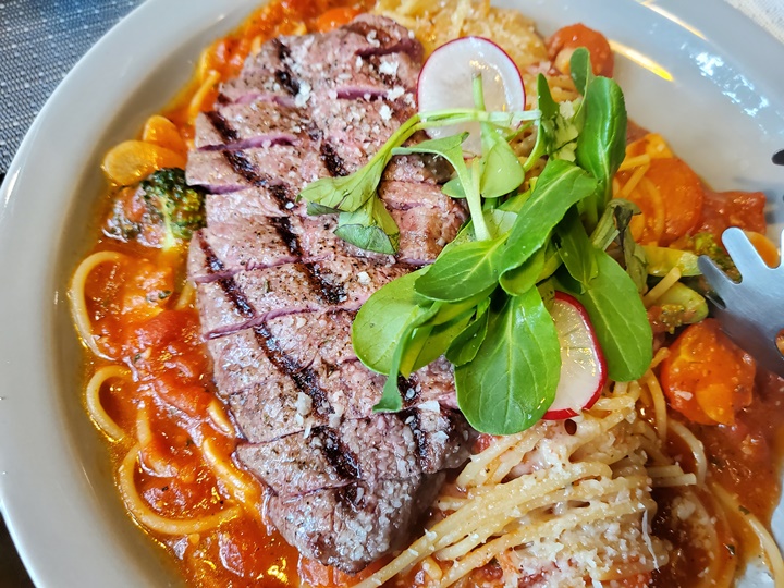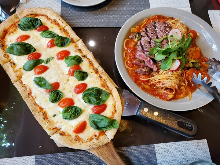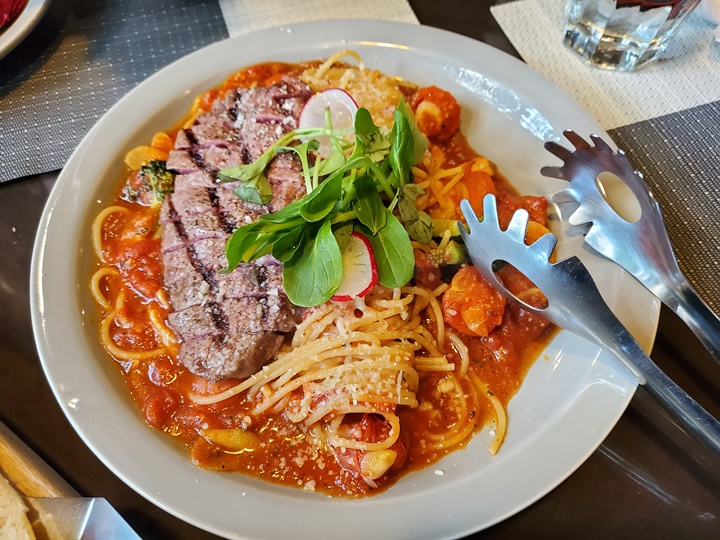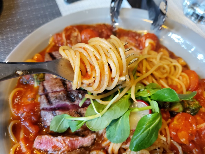 비스테카 포모도로는 토마토소스 파스타 위에 그릴에 구운 스테이크를 얹어낸 메뉴이다. 살치살 스테이크도 꽤 넉넉히 올라가 있어서 가격이 비싸다는 생각은 전혀 들지 않는다.