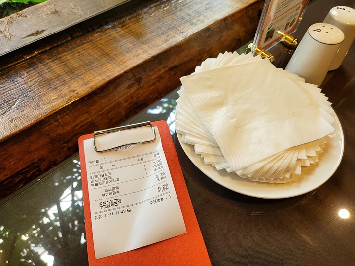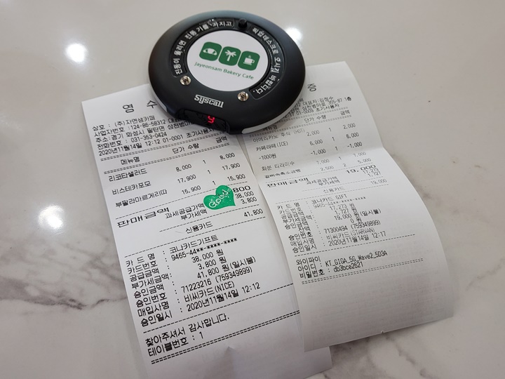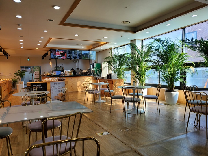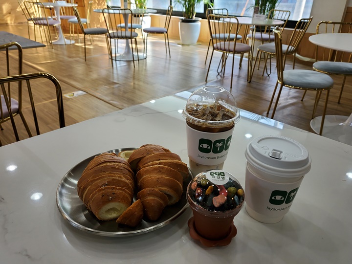 보름 전에 앉았던 자리에 다시 앉음. 소금빵이 매우 맛있어서 소금빵도 주문하고... 아이는 또 화분 티라미수를 사달래서;;; 레스토랑 영수증을 제시하면 아메리카노는 2,000원에 마실 수 있고, 다른 음료는 1,000원씩 할인이 되며 지역화폐 사용 가능하다.