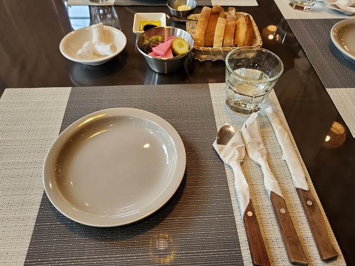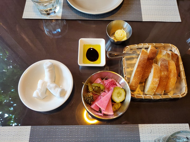 주문하고 얼마 기다리지 않아 개인접시와 코인티슈, 식전빵, 피클 등이 나왔다. 시판 피클이 아니라 직접 담근 피클인 모양인지 재료가 다채롭고, 식전빵은 엄.청. 맛.있.다!