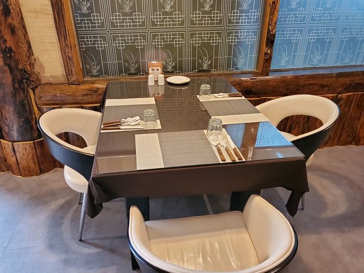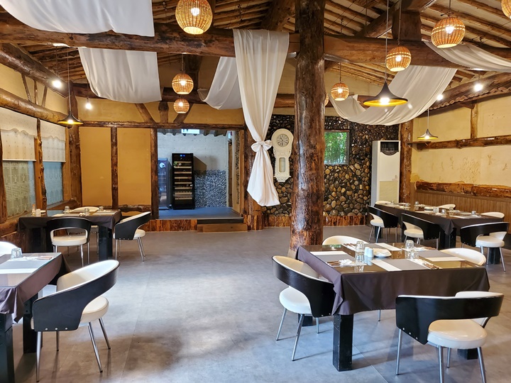 자연샘 레스토랑 내부에는 테이블이 여섯개정도? 서까래가 보이는 인테리어, 테이블 간격이 넓직해서 마음에 들었다. 미리 세팅이 다 되어 있는 상태였고, 예약석도 있었다. 예약석 자리에 앉고 싶었는데 아쉽지만 그 옆자리에 자리 잡았다.