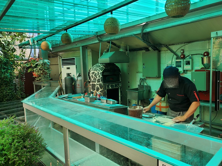 만족스럽게 브런치를 먹고 나서 커피 마시러 자연샘 카페로 향하는 길... 나오면서 보니 피자 주문이 들어왔는지 화덕 앞에서 피자를 만드는 모습이 보였다. 화덕이 레스토랑 입구 근처에 오픈되어 있어서 만드는 과정을 볼 수 있다.