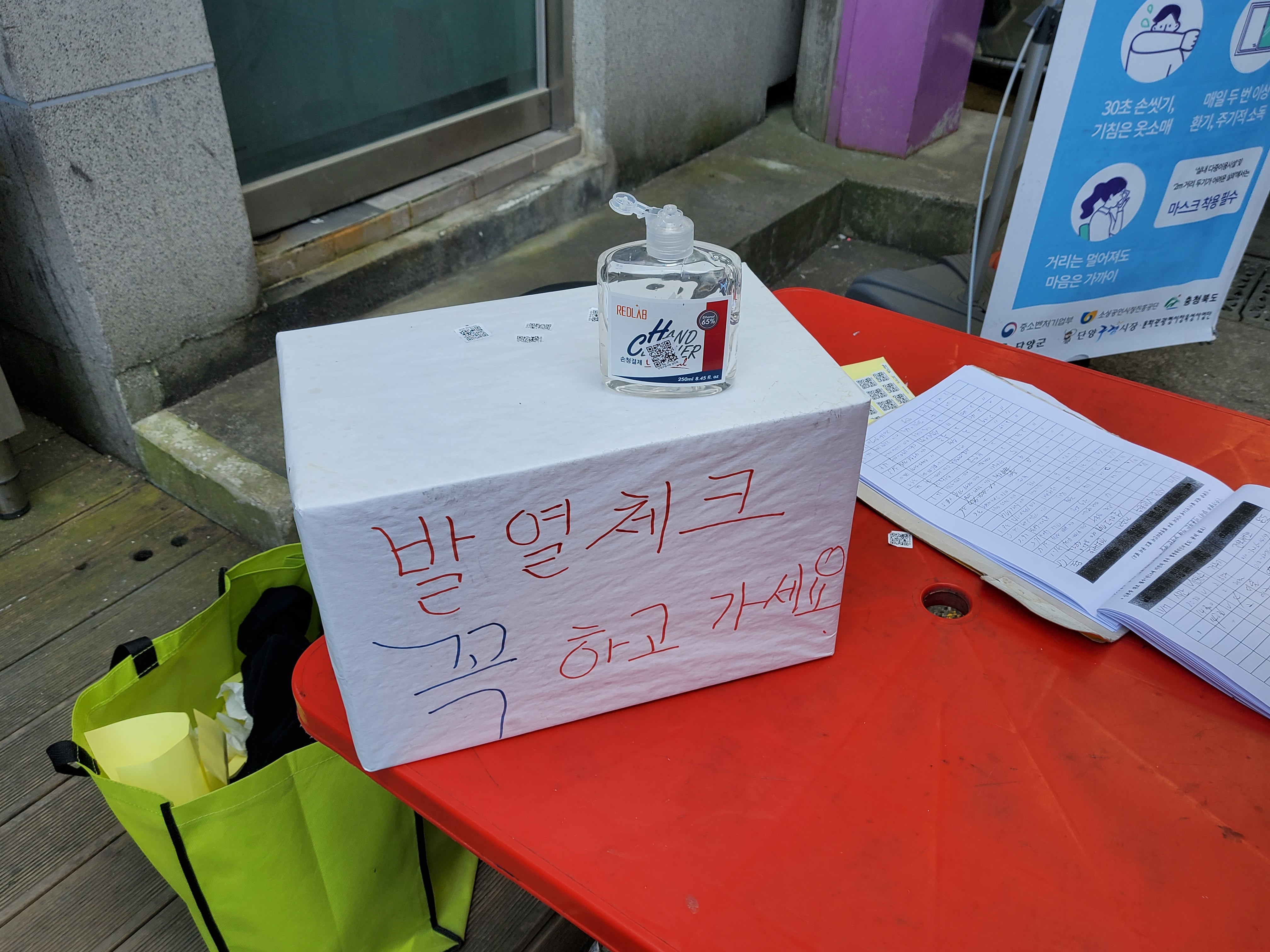 명부 작성과 발열체크를 하면 QR코드 스티커를 붙여준다. 발열체크를 했는지 확인도 하고, QR코드를 읽히면 단양 구경시장 온라인 보이는 라디오 접속이 된다고 했다.