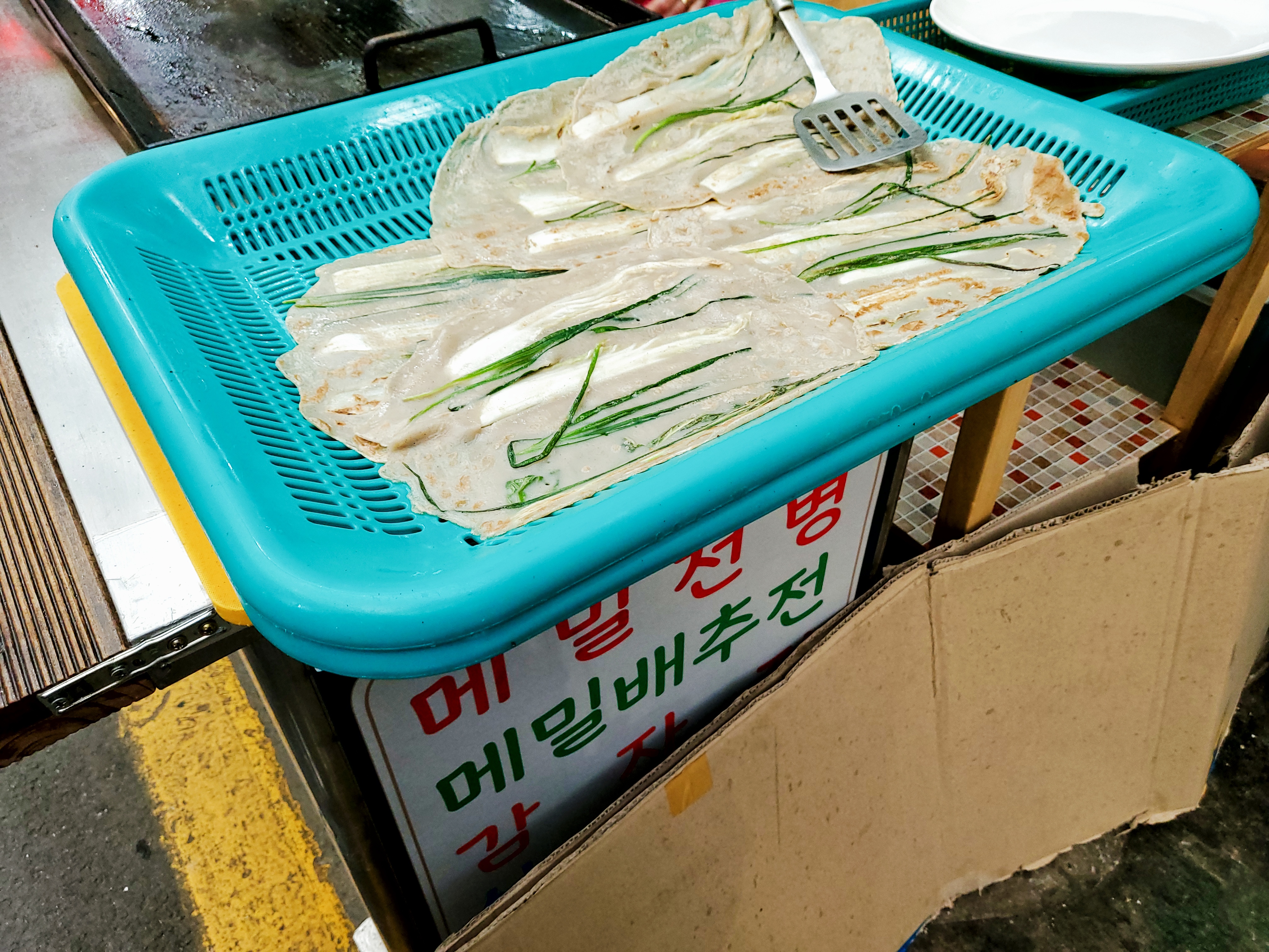 수수부꾸미, 수제어묵, 마늘순대, 마늘만두 등 단양구경시장에 다양한 먹거리가 많아 선택하기 참 힘들었는데... 가장 먹음직스럽게 보였던 것은 바로 메밀배추전이다. 판매하는 곳은 여러 곳이었지만, 여기가 가장 맛있어 보이고 손님도 많아서 포장해왔다. 메밀 배추전은 3장에 5천 원이었는데 3장은 다 못 먹을 것 같아서 1장만 구입했다. 이거 이거 진짜 맛있다. 안 사 왔으면 후회할 뻔했다~