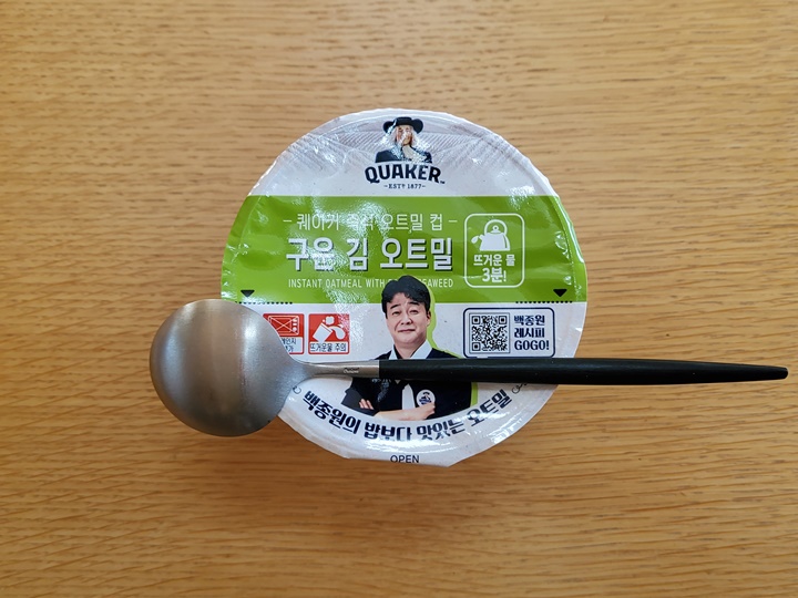 컵 오트밀이니 컵 용기에 담겨 있고 숟가락도 들어 있어 뜨거운 물만 부으면 2~3분 만에 손쉽게 먹을 수 있다. 우선 구운 김 오트밀을 먼저 먹어보기로 했다.