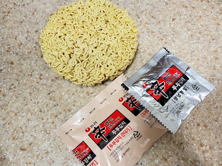 지난주였나 남편이 봉지라면을 사 왔다. 바로 신라면 블랙 두부김치였다. 나의 최애 라면은 진라면 매운맛이지만, 신라면 블랙 컵라면을 아주 좋아하는 남편이 신제품이라면서 마트에서 집어온 거였다. 큰 기대 없었지만 옆에서 기웃기웃해보니 맛있어 보여서 나도 끓여먹어 봄 :D