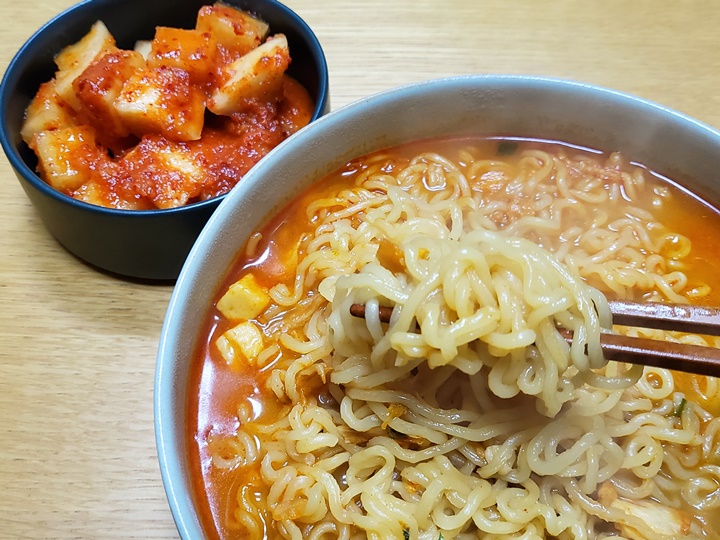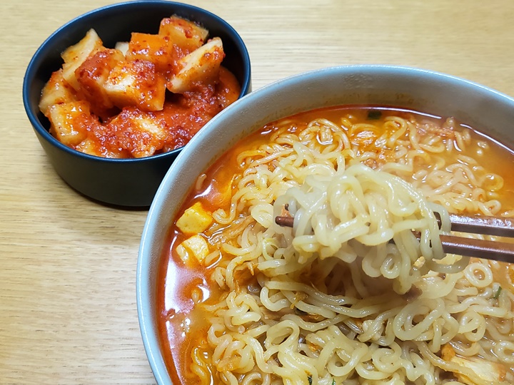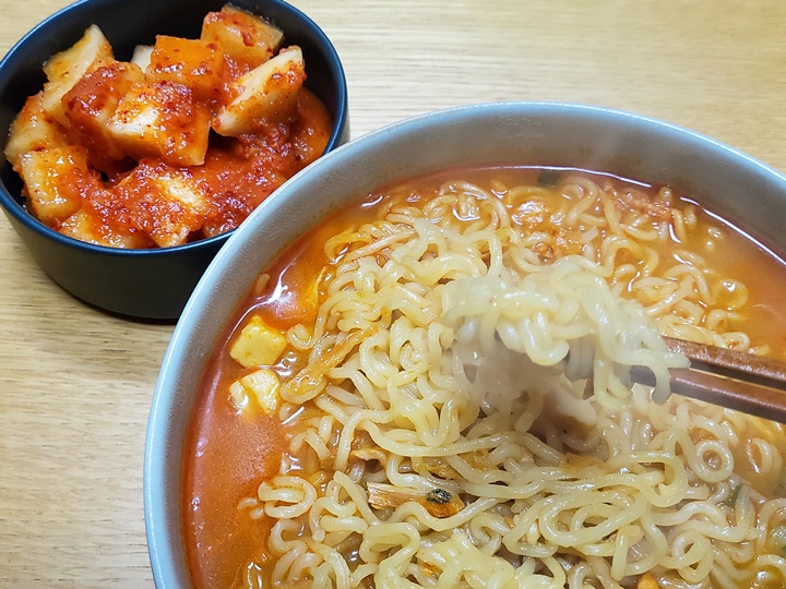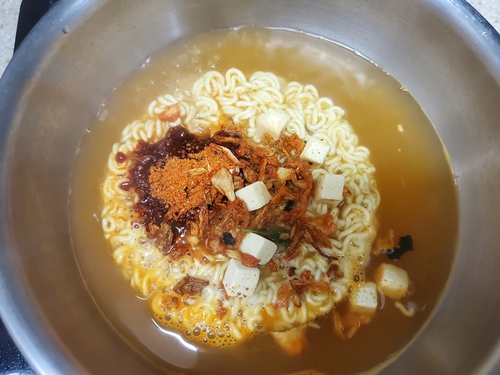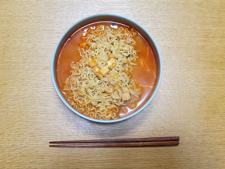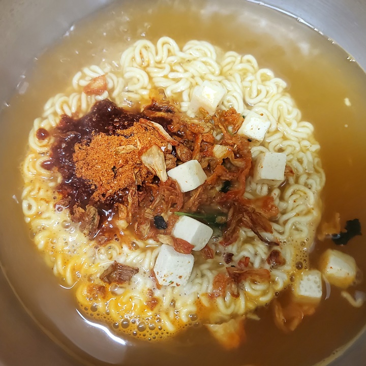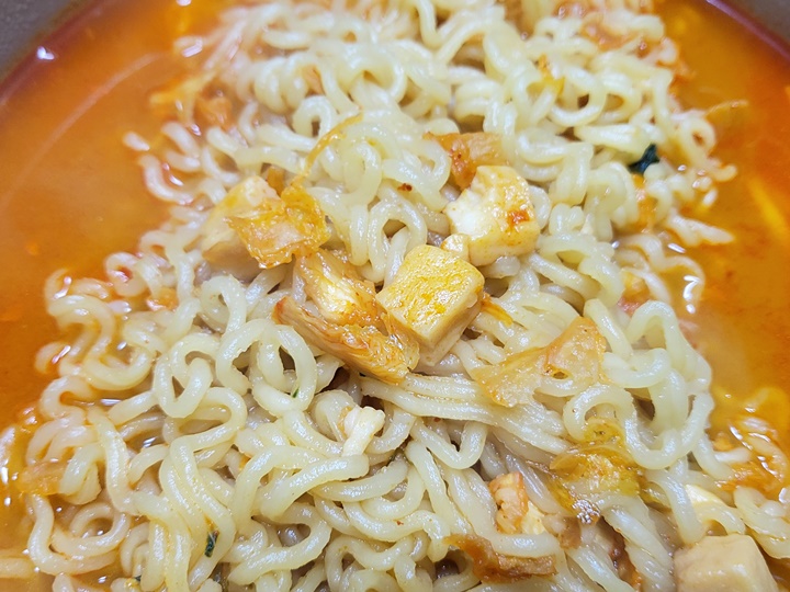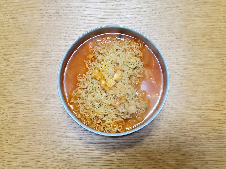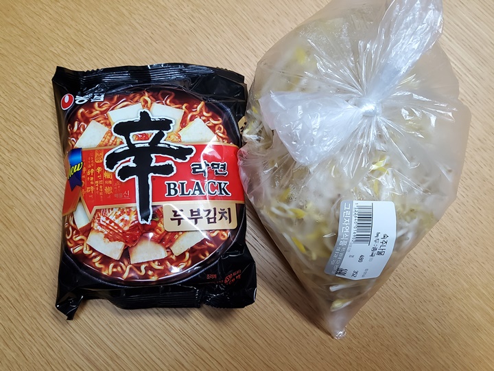 봉지라면은 숙주 넣어서 먹는 것을 가장 좋아하기 때문에 숙주를 미리 씻어서 용기 하단에 깔아두었다. 설명에 따르면 풍성한 두부, 김치건더기, 깊고 진한 국물과 쫄깃한 면발이 조화롭다고 하였지만... 먹어보니 두부나 김치건더기 양이 그렇게 많지는 않다. 라면 2개를 끓여먹거나 봉지라면 하나에 취향대로 조리법을 바꿔 이것저것 추가해서 먹는 것이 든든할 것 같다. 내가 너무 많이 먹는 스타일인가... ^^;;;