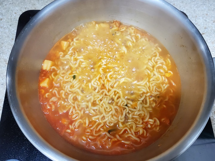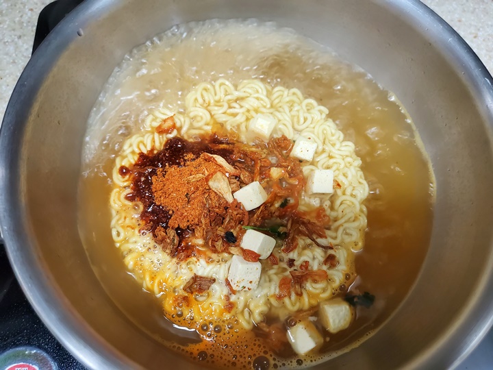 2. 면과 양념분말, 두부김치 건더기를 같이 넣고