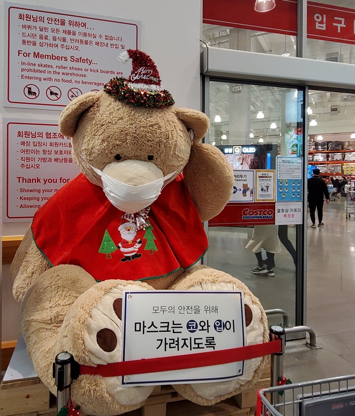 마스크만 착용하고 있던 코스트코 곰인형도 이제는 크리스마스 분위기 물씬 풍기는 망토를 입고 앉아 있다. 귀요미!