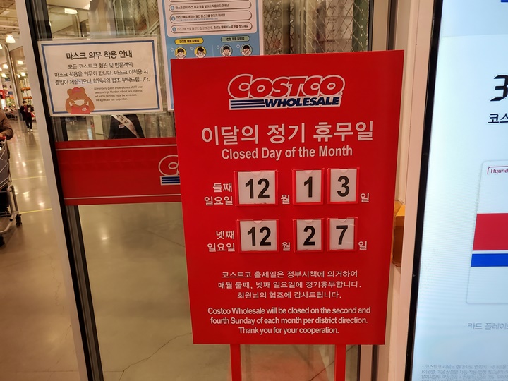 코스트코 정기 휴무일 코스트코 홀세일 공세점은 정부시책에 의거하여 매월 둘째, 넷째 일요일에 정기 휴무한다. 다음 정기 휴무일은 12월 13일과 12월 27일이다.