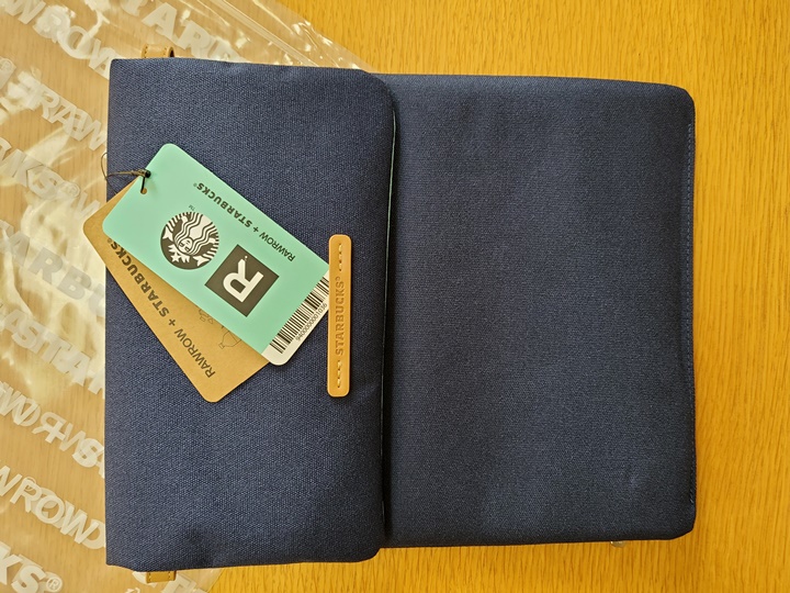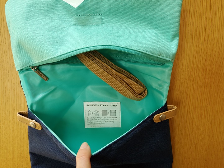 폴더블 크로스백 네이비, RAWROW+STARBUCKS가 반복적으로 프린트된 지퍼백에 담겨있다. 크로스백 겉감 원단에 사용된 원사는 버려진 페트병을 재활용하여 생산한 100% 재생 원사라고 한다. 스타벅스 폴더블 크로스백 생산시 사용된 재생 원사는 버려진 500ml 페트병 230만개를 재활용하여 만들었다고 쓰여 있다.