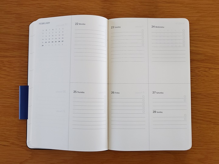 사이즈 130x210mm 288pages로 위클리 플래너인데 속지 GOOD! 매달, 매주별 기록, 생각 기록하기, 발상 남겨두기, 오목 두기 좋은 페이지 ㅎㅎ, 땅따먹기 하기 좋은 페이지로 내지가 구성되어 있다.