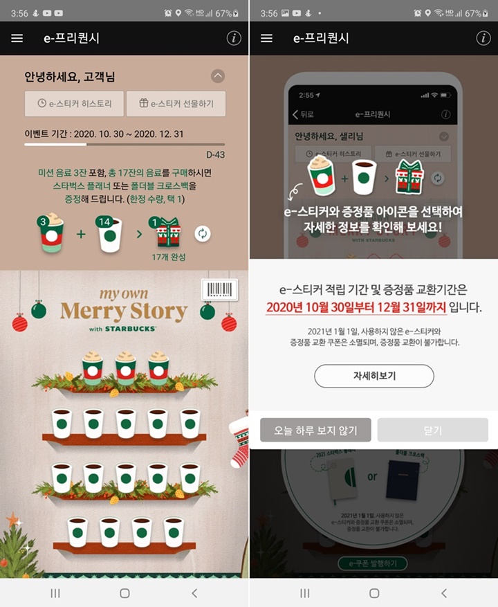 2020 크리스마스 e-프리퀀시 행사로 미션 음료 3잔 포함 총 17잔의 음료를 구매하면 2021 스타벅스 플래너 또는 폴더블 크로스백을 받을 수 있었다. 별이 쏟아지는 스타벅스 현대카드 발급받은 후로 더 자주 스타벅스에 가는 것 같지만, 그저 기분 탓인가 보다. 많이 마신 것 같지만, 며칠 전에야 프리퀀시 두 판 완성하고 증정품인 다이어리와 폴더블 크로스백으로 바꿔왔다.