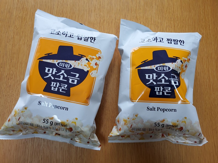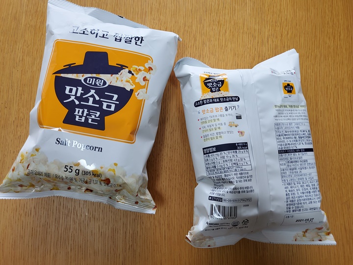 집에서 보내는 시간이 많아지니 동영상 시청하면서 입 심심하지 말라고 편의점에서 팝콘을 구입했다. CU는 곰표, 세븐일레븐에 천마표시멘트가 있다면 GS에서는 미원 맛소금 팝콘을 살 수 있다. 우리 동네 GS에서는 못봤는데 지난주 은행업무차 옆동네에 갔다가 근처 편의점에서 발견하고 바로 사 먹고 남기는 내돈내먹 후기이다.