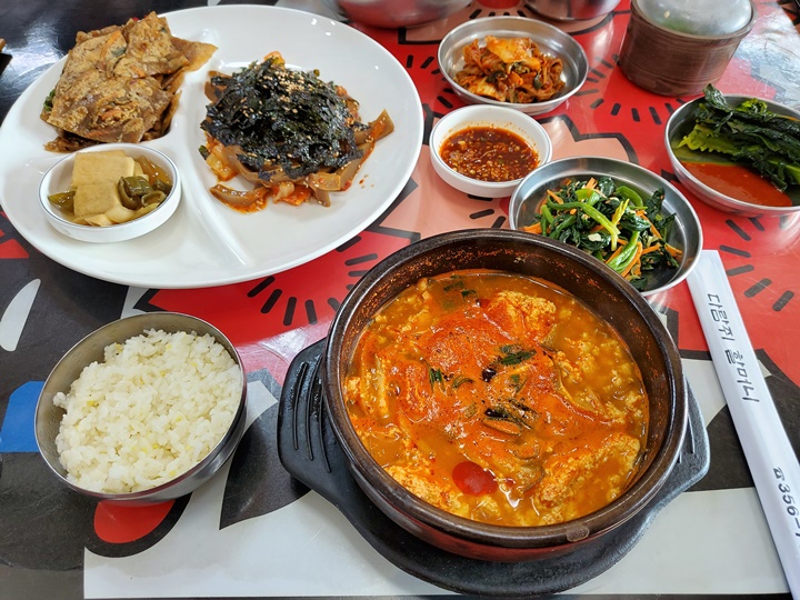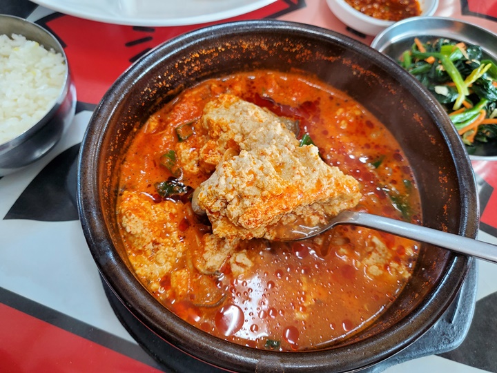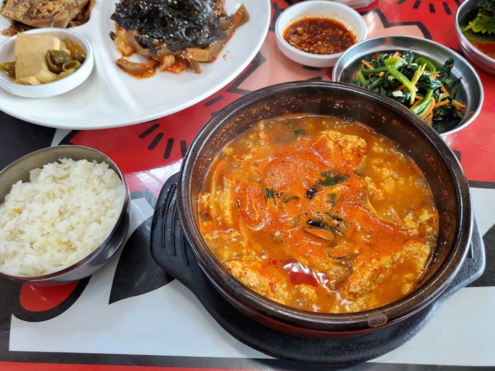 내가 먹은 것은 순두부찌개이다. 평소 순두부찌개를 그리 즐기는 편은 아닌데, 지난번에 다람쥐할머니에서 두부김치 먹어보니 두부류도 맛있을 것 같아서... 그리고 추운 겨울이라 땀 내어 먹고 스트레스 날려 버리고 싶어서 선택했다.