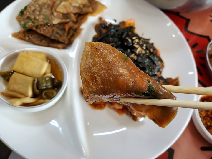 탱글한 식감의 도토리묵, 양념과 김가루가 더해져 더욱 맛있는 맛! 전은 처음 먹어보는데 진짜 강추 메뉴이다. 종종 먹던 부침개랑은 다른 매력, 더 속이 편하다. 야들야들한 식감이라 아이도 좋아한다.