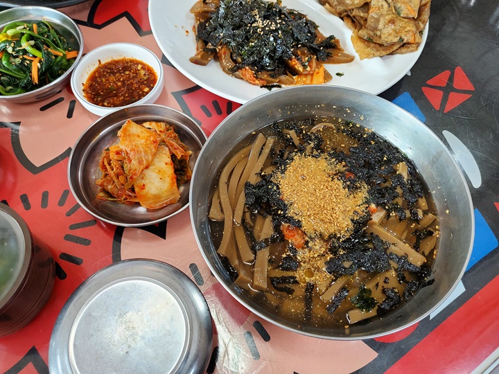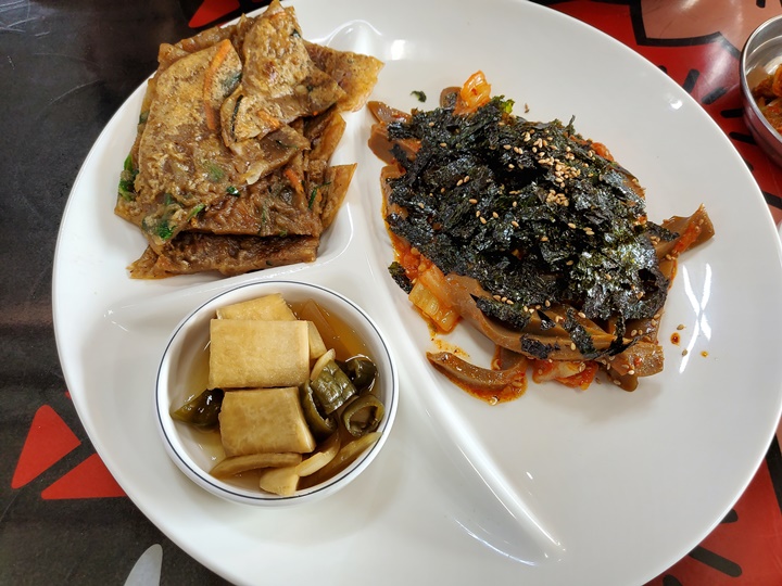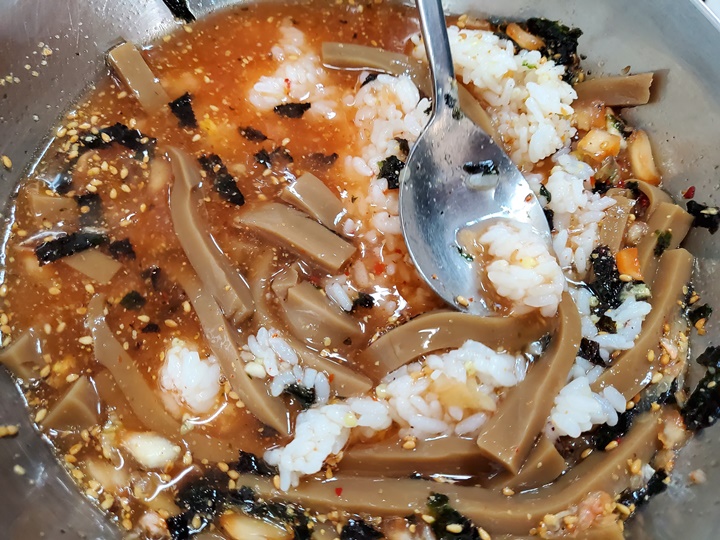 반찬은 3가지가 나오는데 날마다 바뀌는 듯? 이번에는 잘 익은 배추김치, 시금치나물, 초장과 함께 데친 미역이 나왔는데 반찬도 맛있다. 특히 시금치나물이 짜서 맛있음;;;