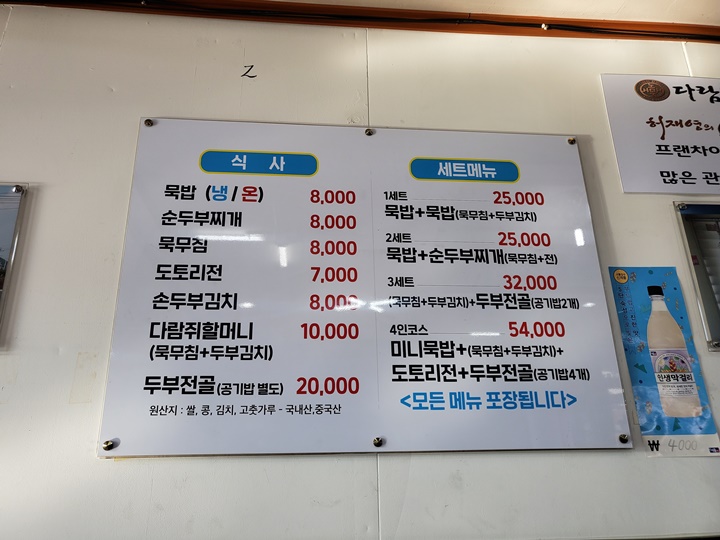 세트메뉴에 같이 나오는 묵무침이나 전은 단일 메뉴 대비 절반 정도의 양이 되려나? 하나씩 다 시키기엔 부담스럽고, 다양하게 메뉴 먹어보고 싶을 때 주문하면 좋다. 1세트에는 묵무침과 두부김치가 나왔는데, 2세트는 묵무침과 도토리전이 나온다.
