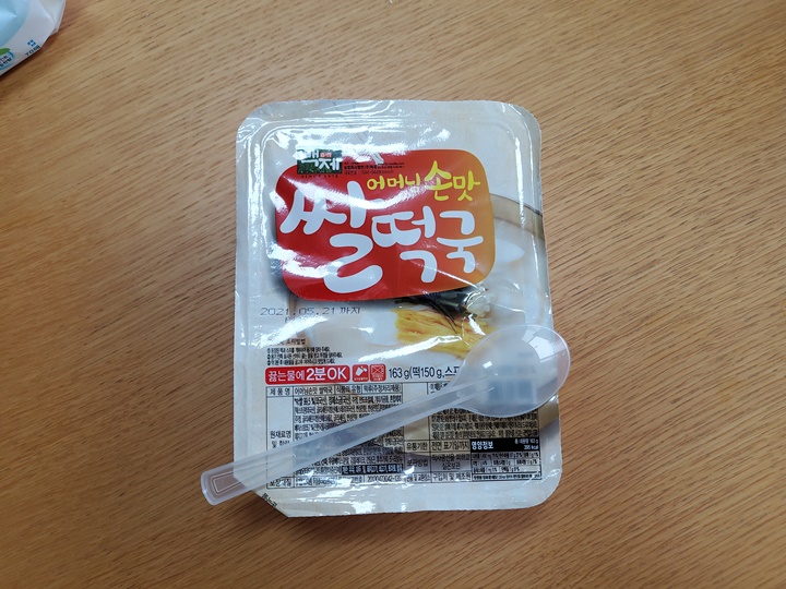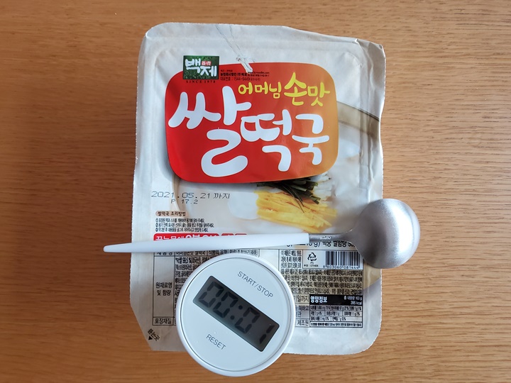 즉석떡국과 함께 개수에 맞게 일회용 숟가락도 들어있다. 유통기한은 2021년 5월 21일까지이지만, 그 훨씬 전에 모두 다 먹어버릴 기세이다. 왜냐면, 조리방법이 매우 간단하므로! 끓는 물에 2분이면 끝이다.