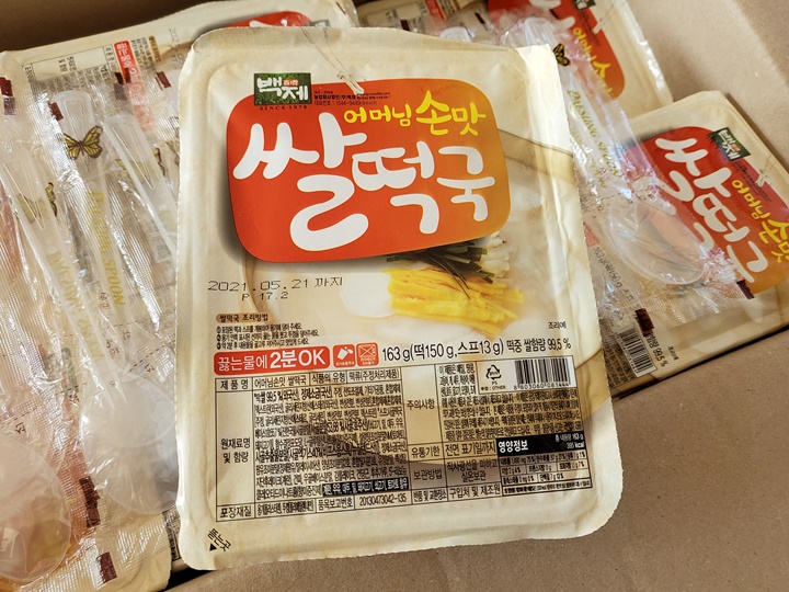 떡이 150g이고 스프가 13g이다. 이 제품에 사용된 떡 중 쌀 함량은 외국산이 99.5%. 외국 어디인지는 쓰여 있지 않다. 스프는 사골 떡국 베이스로 호주산 사골 분말, 뉴질랜드산 사골 추출분말 등이 들어있다.