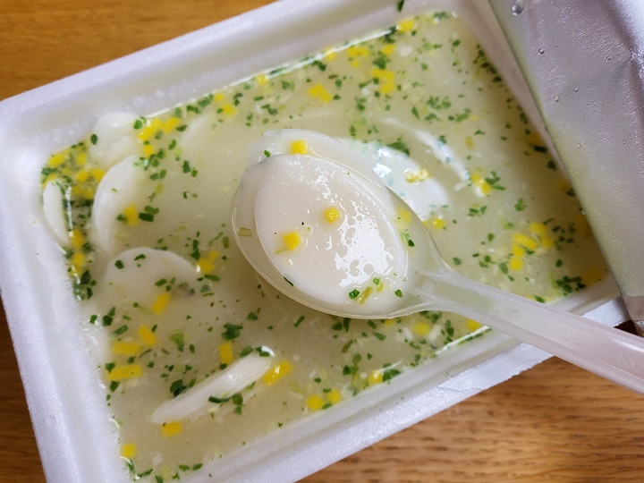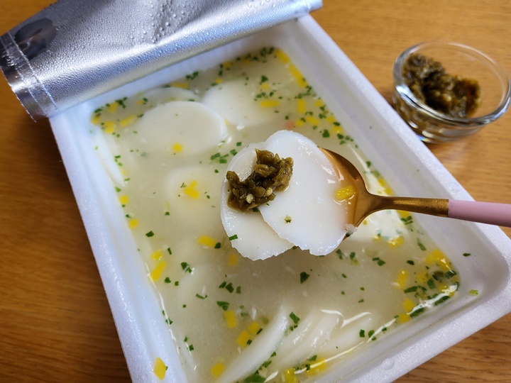 끓는 물 2분이라고 했지만, 정수기 온수 (커피물)로 딱 2분 후 먹어도 신기할 정도로 쫄깃하고 짭조름한 사골 육수 즉석 떡국이 완성되었다.