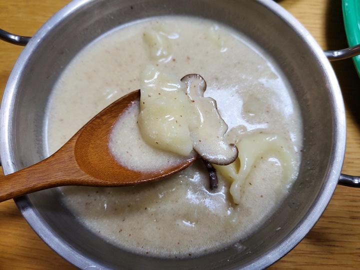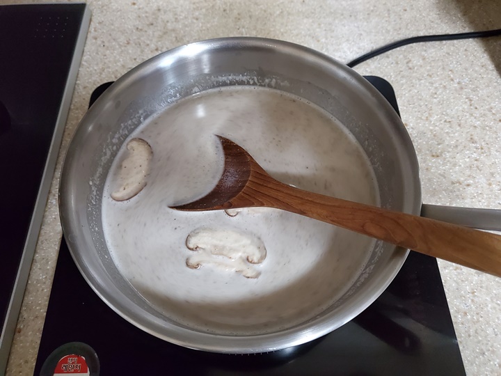 1. 냄비에 육수를 부은 후 육수가 끓기 전에 들깨가루와 쌀가루 표고버섯을 넣고 잘 풀어준다.