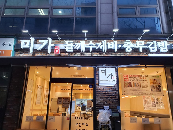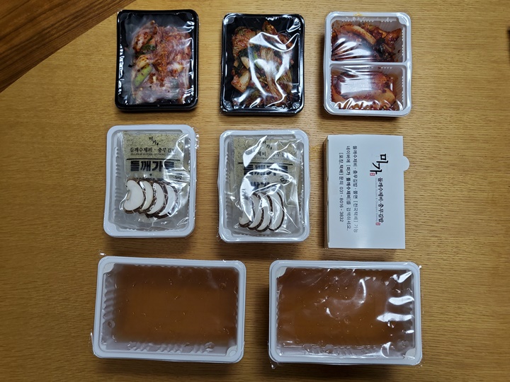 내가 직접 간 것은 아니고 남편이 포장해 왔는데 영수증을 보니 24,300원이길래, 포장비를 받는 건가 했더니...? 들깨수제비는 8,500원 (2인분 17,000원)이고 충무김밥이 7,300원이다. 이외에 쫄면도 있는데 미가 쫄면은 6,900원이다. 수제비 2인분에 충무김밥 1인분 주문해서 24,300원이었던 것.