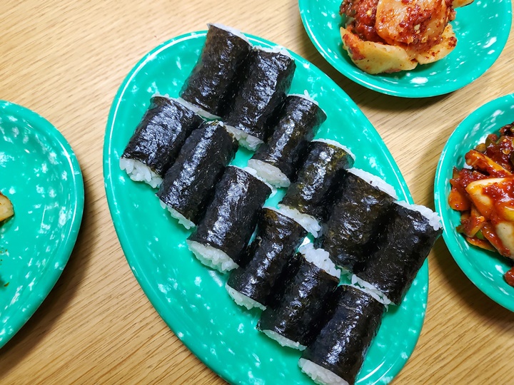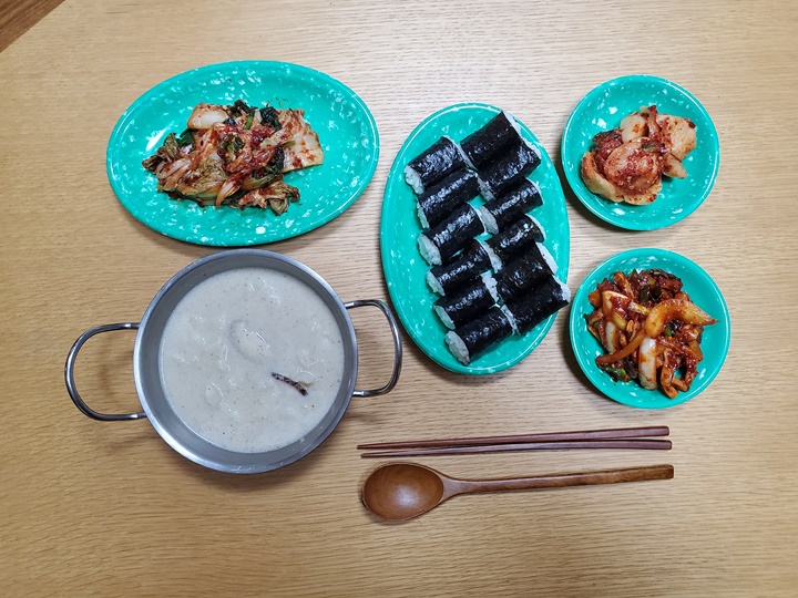 포장해 온 당일에는 충무김밥과 들깨수제비 1인분만 끓였다. 우리집에서 들깨수제비 좋아하는 사람은 나 혼자뿐이라... 예전에 마트에서 뭐 구입하고 사은품으로 받은 분식집 접시 꺼내서 ^^