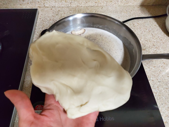 2. 반죽을 최대한 얇게 뜯어서 넣어준 후 반죽이 눌어붙지 않도록 끓이면 완성!