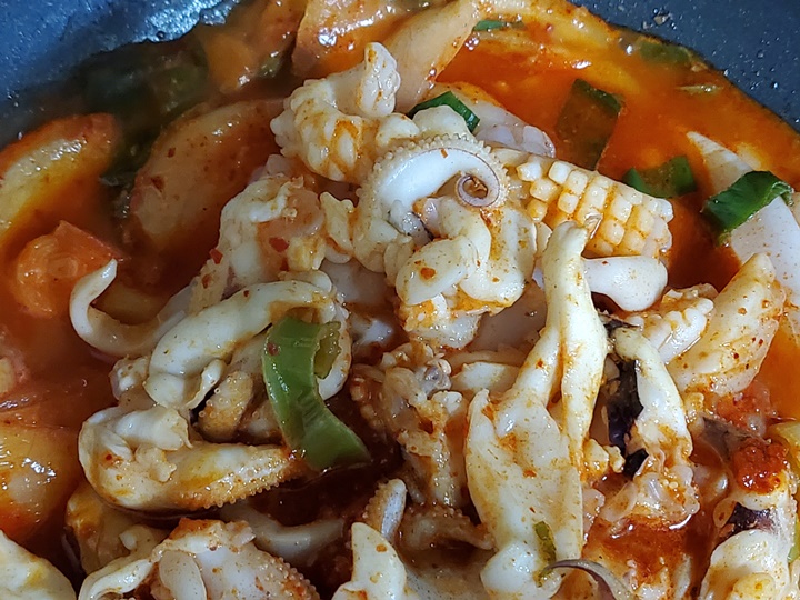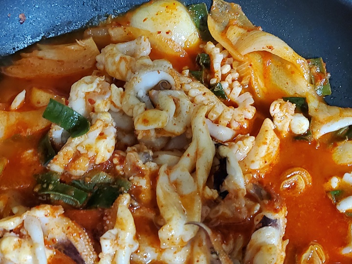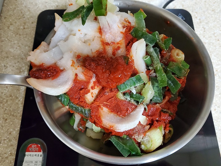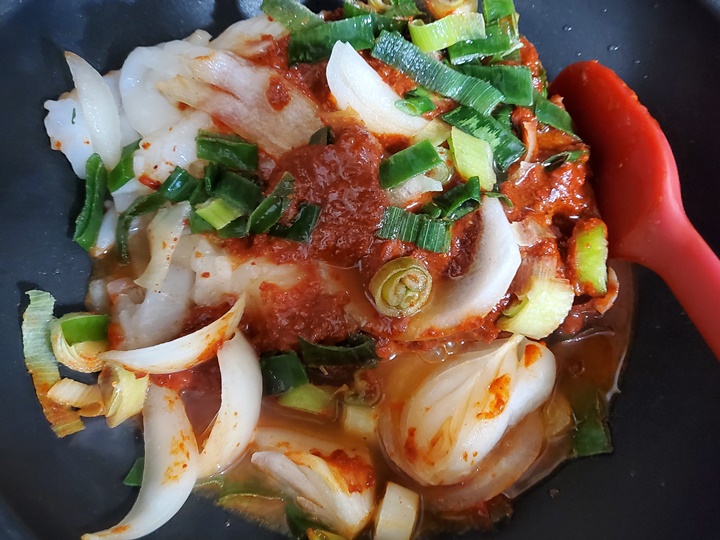 처음에 양 가늠이 안되어서 작은 스텐 웍에 넣었는데 냉동이라 내용물이 각져있어서 좀 더 큰 웍으로 바꿔서 조리했다. 꽁꽁 얼어있기 때문에 정수기 온수 커피물 온도 반 컵을 부어 녹이면서 조리했다. 조리하다 보면 양파에서 나오는 물도 자작하게 생기니 당면 등을 추가해서 먹을 것이 아니라면 굳이 생수는 추가로 넣을 필요는 없다.
